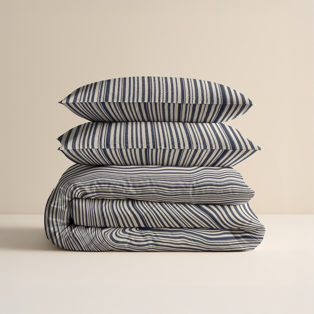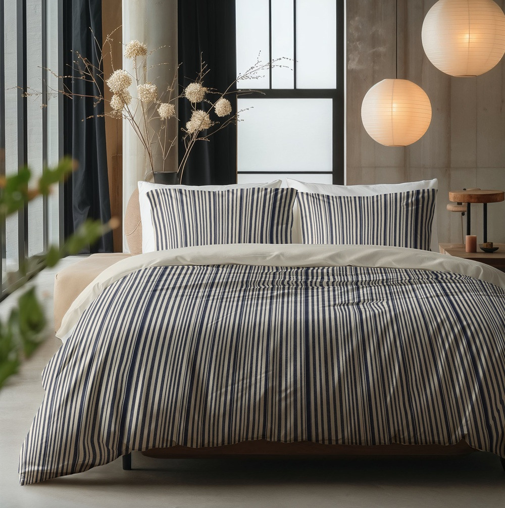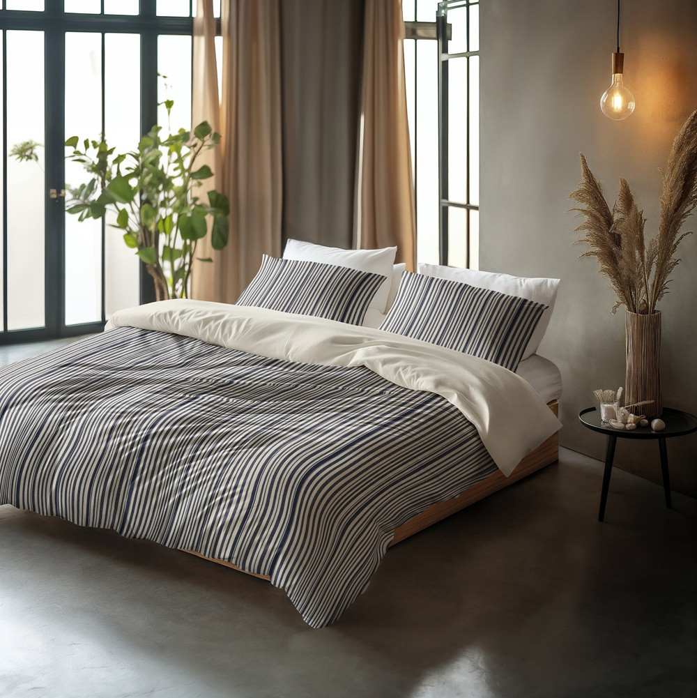 Sengesættet Blue Regatta kombinerer klassisk elegance med komfort. Det smukke design har marineblå striber på en cremefarvet baggrund på den ene side og en ensfarvet, rolig cremefarvet tone på den anden.